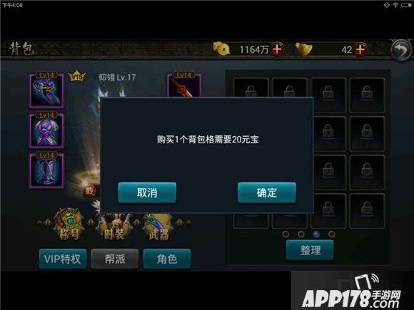西游降魔篇动作版背包分为4栏,每栏可以放置16件装备,后面的背包解锁需要20个元宝解一个格子。
