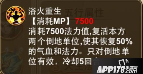 浴火重生:消耗7500法力值,复活本方两个倒地单位,使其恢复50%的气血和法力。只对倒地单位有效,冷却5回合。