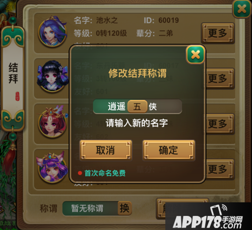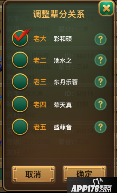 玩家完成结拜仪式后,队长默认作为本组结拜关系的大哥(大姐),队长可以到长安城-主簿处调整其他成员的辈分关系。