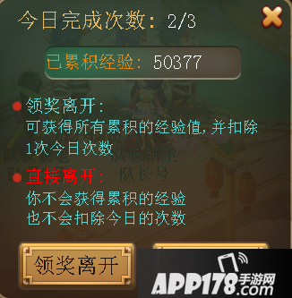 在途中选择【领奖离开】的玩家将会消耗本次参与次数并领取本次副本至今累积的经验值然后离开副本。