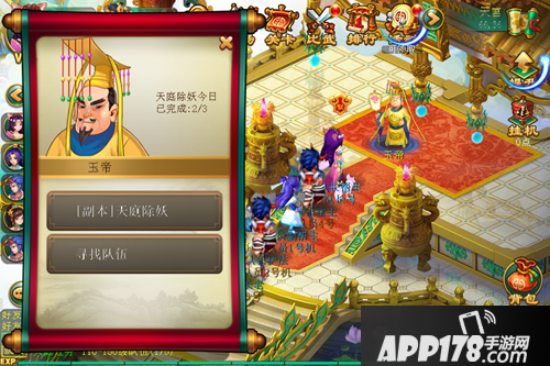 天庭任务的副本入口位于“天宫”地图当中的“玉帝”处,玩家可以通过地图传送或者活动当中的日常任务传送,将自己传送到“天宫”这幅地图。