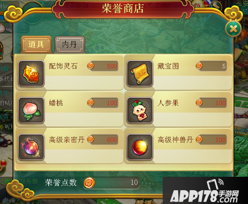 “道具”分类中主要出售的是一些经验类物品、藏宝图以及配饰灵石。在早期荣誉值比较稀缺的时候,建议玩家把荣誉值都用于购买配饰灵石。因为这是打造高级装备的必需品,而且也只能从荣誉商店中获得。