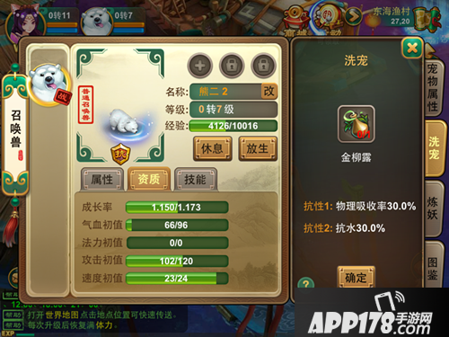 获得召唤兽以后,玩家可以查看召唤兽的天生资质。而召唤兽的成长率与四项初值,会一直影响召唤兽往后的提升。如果,玩家不满意召唤兽的天生资质,可以使用“金柳露”重洗宠物的资质。