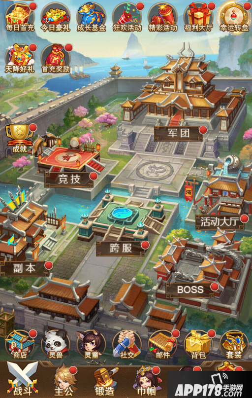 2、进入游戏里面之后呢,先根据任务提示走,例如升几下武将,熔一次装备总之先升到20级,主城有些奖励可以领取,同时也能看到当天的活动奖励,玩家可以根据自身条件适当的充值。
