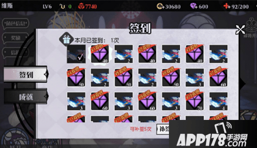 点击奖励按钮,即可进入到签到及成就奖励领取界面。每天保持签到,丰厚奖励随心拿~VIP等级越高奖励也越好哦!