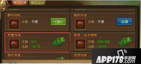 2.恶魔深渊。完成70级主线任务后开启。前期任务所累积的经验,对100级的角色来说如九牛一毛。而完成恶魔深渊任务,可以使你的等级飞一般的提升~配合1.5倍经验药水,经验加成更加丰厚!