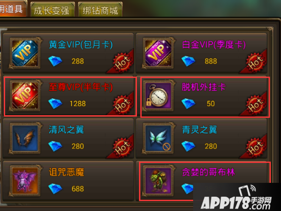 拥有了大量的钻石,我们可以拿它的做什么?这里推荐两个升级和提升战力的必备道具:①至尊VIP卡 ② 脱机外挂卡。③贪婪的哥布林。点击游戏主界面右上方的“商城”,选择“常用道具”,即可购买。