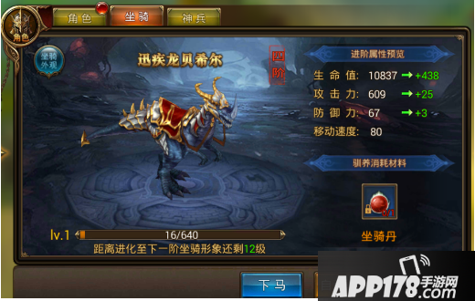 2.坐骑驯养。点击左上方角色头像,再选择坐骑,即可进入坐骑提升界面。使用钻石购买“坐骑丹”可以使坐骑进化。由于钻石数量的有限,小版建议大家可以至少把坐骑提升到三阶“地狱战马”,点击“自动驯养”,可以使提升更快速~