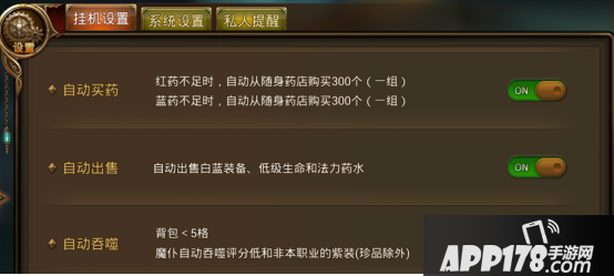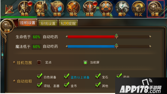 1、挂机前要设置好相应的挂机设置,挂机设置玩家可以在“设置”→“挂机设置”中进行。