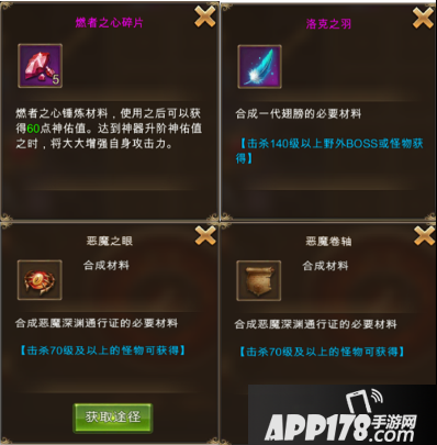 击杀普通怪物和精英怪物会给玩家一定的经验、金钱和装备奖励,玩家通过大量击杀怪物,积累金钱、提高等级、快速增加战斗力。同时,击杀一定等级以上的怪物会有几率获得洛克之羽(合成一级翅膀)、神兵粉尘(提升神兵等级)、恶魔深渊材料(合成恶魔深渊门票)等稀有道具。