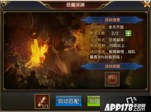 4、赏金任务每天必须完成,有大量的金币和经验;恶魔深渊更加是少不了(最好是在当天经验获得的任务都完成再打),它是经验获得最高的来源,建议组队一起打,有组队经验加成,同时最好能够进行鼓舞(如果是非R可以用金币鼓舞到50%,如果是土豪那么可以鼓舞到100%),经验丹也要吃(最好是2倍,没有的用1.5倍也行),打完恶魔深渊一般还要等3分钟左右才能再打下一次,这个时候可以去做一下单人副本或者直接挂机打怪,在经验丹的持续时间内把恶魔深渊都通关完。(当然啦,有钱的土豪可以提升vip等级增加购买次数)