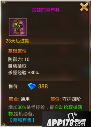 3、获得贪婪的哥布林也是如此,它能够提升人物杀怪经验的30%,最好能够在它存在的时间段内,把主线任务做完,如果够时间能够把恶魔深渊打完就更加好了。