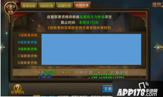 战盟联赛资格将根据战盟战斗力排名评定,截止时间为周日19:00。同时,为了防止2个对战战盟之间实力差距太大,战盟联赛分为5个等级,分别为S,A,B,C,D五种联赛,每个级别的联赛有4个战盟参加。