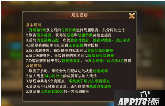 整个战盟联赛是以获得资源量来盘点胜负。大战场一共有5个资源点。占领资源点就可以获得资源,最先获得2000资源量的战盟获得胜利。