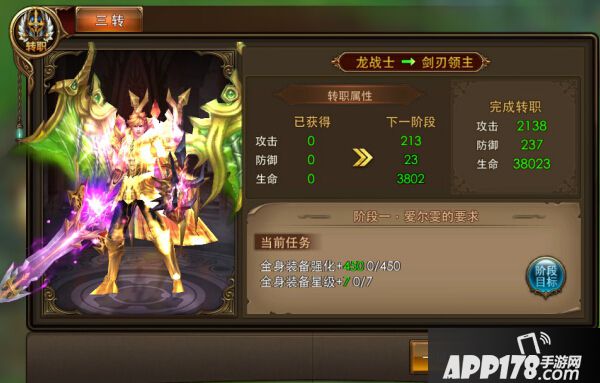 第一阶段要求玩家达到全身装备强化等级+450,全身装备星级数量+7的条件,这也是为转职后面临的凶险世界打下坚实的基础!