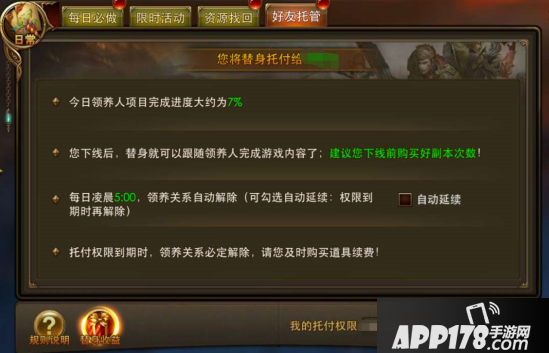 好友托管系统就讲解到这了,欢迎大家一起来讨论!个人觉得这个系统还是蛮不错的,门槛不高,土豪没空可以帮忙托付给好友帮忙做任务(不用担心给号给别人导致被盗号),获得的副本活动奖励也是100%跟自己手动没差,好友也可以通过这个来赚点零花钱。