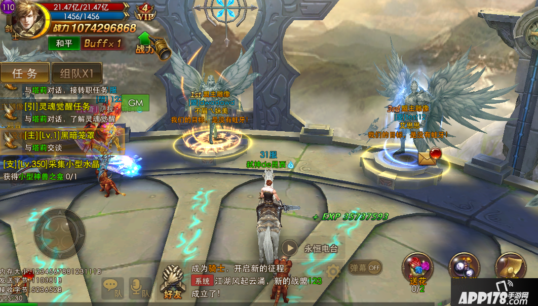 光之纪元1000年前,镇压恶灵的天之神戒散落在各个大陆,唯有集齐25枚神戒,才能阻止世界被恶灵毁灭。救世少年们应天命而集结,他们勇敢肩负起拯救世界的重任,一路闯关杀怪、组队战斗,开启了一段热血寻戒之旅!世界服开启前,本服内联赛战力排名前三的战盟,将在诺玛村庄出现盟主雕像;向雕像送花和扔炸弹时,可获得经验丹和金币。送花可以增加雕像好感值,扔炸弹会降低雕像好感值;
