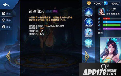 三技能迷魂仙乐,混乱一名敌方英雄1.5秒同时满级造成350魔法伤害,冷却时间8秒,施法距离900。这边可以看到,小乔的1,2,3技能范围同时都是900,所以大家如果空间感好的话,玩起小乔来会如鱼得水。