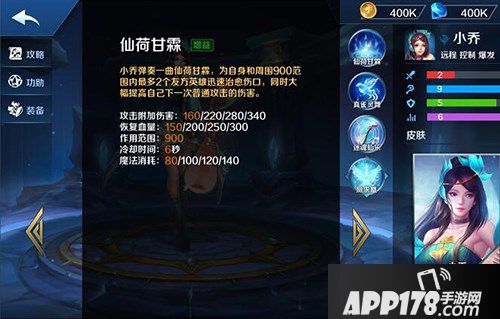 一技能仙荷甘霖,治疗自身及900码范围内两名受伤的英雄,并且提升下一次普攻伤害,冷却时间仅6秒,能提升伤害的持续时间也为6秒,等于说只要时间卡的好,可以释放一次仙荷甘霖后等待5秒,再攻击敌方英雄,一秒后立刻再释放再平A,配合其他小乔技能,能够出其不意轻松击杀。