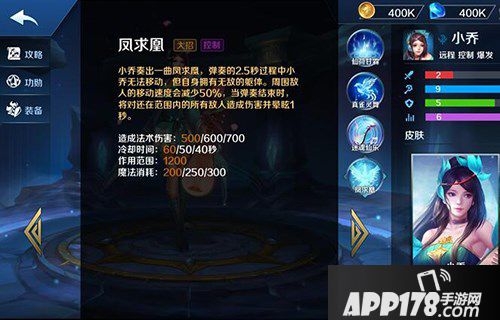 终极技能凤求凰,弹奏一曲凤求凰,持续2.5秒,小乔自身会变成无敌状态,期间1200码大招范围内敌人减速50%,当弹奏结束时还处于大招内敌人将额外晕眩1秒钟且受到500/600/700点魔法伤害。和PC的大招不太一样,主要体现在2个点上