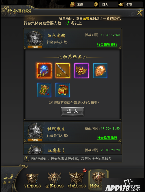 3.行会BOSS的道具奖励被拍卖后,所得利润将有参与击杀BOSS的行会成员平分。