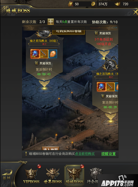 暗域BOSS是玩家在加入公会之后开启的新BOSS系统,玩家可以在这里通过击杀BOSS获得4阶橙色装备,以及圣火套装石,更有机会获得极品特戒!战力暴涨!