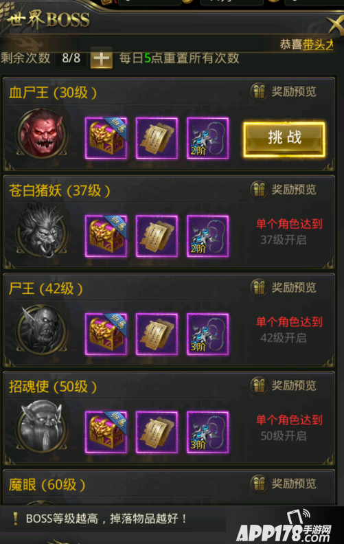 世界BOSS需要完成足够的主线才能开启,最简单的一层是30级,每层的开启条件为单个角色的等级到达对应等级即可,同样的,等级越高的BOSS掉落的奖励越高级。每天5点重置当天的免费8次挑战机会,需要珍惜这8次机会,使用完毕后还需挑战则需要花费20元宝,当然,花费元宝购买次数也是有10次限制的。