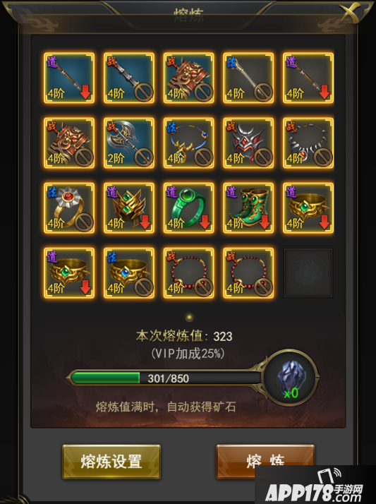 在背包界面点击熔炼,就可以把无用的装备回收,变成可以提升装备等级的矿石了。在游戏后期,装备等级的提升是战力加成不可或缺的重要一部分。