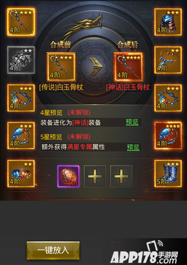 传说装备可通过此方式提升星级,星级提升至5星后即可进阶成神话装备,除基础属性能大幅提升外,还能获得更多条附加词条。另外神话装备均拥有一条神话属性,属性将随角色等级提升而成长。