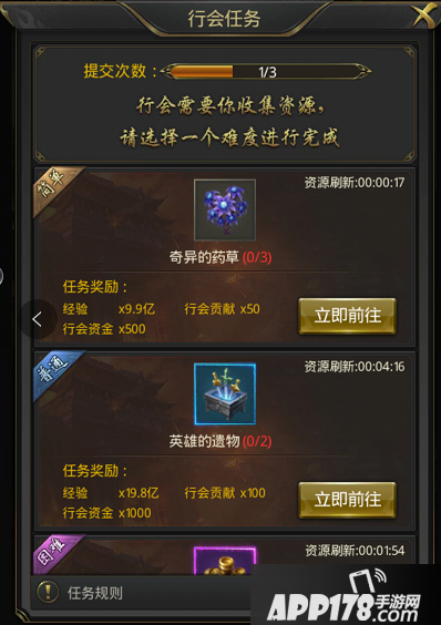 每天每个成日可完成三次行会任务,在暗域一层采集相应道具提交即可完成。可以进行采集的道具有三种,分别为:奇异的药草、英雄的遗迹、散落的金器,从左往右道具越稀有,同时上交后的收益也越高。但是需要注意的是,暗域一层为中立地图,不同行会的成员是可以相互PK的哦!
