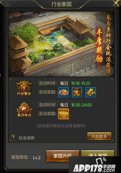 每日行会宴会及每日传功的场所。每日19:10-19:25,行会家园将开启行会宴会,行会成员可在家园内答题及挂机,可获得丰富经验、材料及道具奖励。另外每日18:30-24:00将开启每日传功玩法,行会成员间相互传功可获得丰富经验奖励。