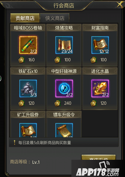 行会商店是各个行会成员专属的免费商城。每天完成行会任务即可获得行会贡献,而协助行会成员夺回矿产、抢回镖车或夺得BOSS最终归属即可获得侠义值,行会贡献和侠义值均可在行会商店中购买各种必需品及绝版称号。