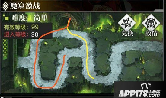 魔窟激战有两个进攻路线,一条是一般怪物进攻路线,攻击不高,可以硬抗。另外一条是战鼓兽进攻路线,因为有BUFF加成,所以攻击很高,需要准备高防御的近战当肉盾。