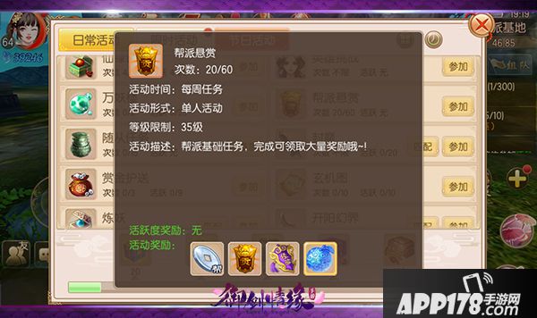 2.帮派悬赏任务分为白、绿、蓝、紫4个等级,任务奖励依次提高;
