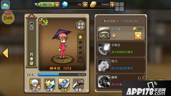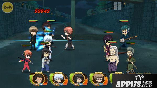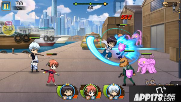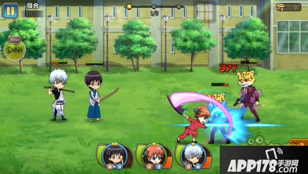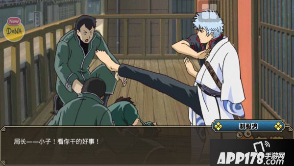 角色技能贴合人物形象,像银桑的乱斩、机车撞击、武士魂、糖分摄取,新吧唧技能是吐槽、泰山劈、噪音、变身眼镜(这明明就是本体),神乐技能是风车腿、伞炮击、怪力、腹黑,看出DENA的正版诚意,角色有四种不同展现的形态还有四句不同的经典台词,有一股深挖角色特质的感动。