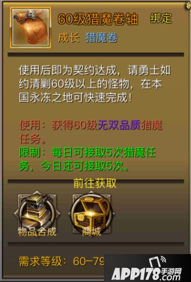 猎魔卷轴是开启猎魔任务的道具,猎魔任务类型只有杀怪一种。使用猎魔卷轴后,需要击杀指定数量和等级的怪物才能完成任务,任务完成可获得高额的经验奖励和3点活跃度。猎魔任务全天开放,每天可以完成5次。猎魔卷轴可以通过地宫刷怪掉落、商会跑环和商城购买获得,猎魔卷轴的品质由低到高对应白、绿、蓝、紫、橙五种颜色,品质越高,奖励越丰富。绿色以上品质的猎魔卷轴只能通过合成获得,5个低级的猎魔卷轴可以升级成一个高级的,高品质的猎魔卷轴经验更高,但是需要击杀是怪物数量也会增加。