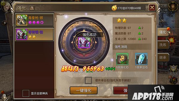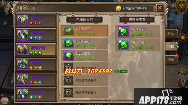 等级、技能不必多说,装备需要通过升级、升阶和宝石镶嵌以及镌刻提升。其中宝石较难获得,高等级的宝石可以通过低等级的宝石合成获得,每3颗同等级宝石可以合成为1颗更高级的宝石(例如:3颗1级宝石可合成为1颗2级宝石),高等级的宝石加成的属性效果将大幅度提升。宝石可以通过完成日常任务获得宝石礼盒开启、在商城中购买获得。当装备升品至绿色品质后,装备会解锁铭文槽,不同装备可镌刻不同的铭文,不同类型铭文可以对应加成攻击、物防、生命、法防、元素攻击、元素防御等属性。