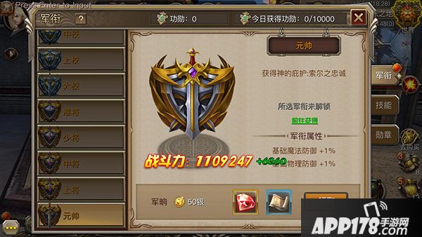 通过完成任务可以获得功勋(功勋通过击杀敌对阵营玩家和参加国家活动获得)。职位会随着功勋值的提升而提升,职位提升会解锁众神之力和神之庇护并提升附加属性。同时获得职位后每日可领取一定的军饷。