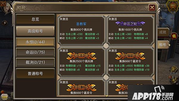 完成特定的成就即可能够获得相应的称号。每一称号都附带主动和被动两种属性,获得称号后会获得称号的被动属性(称号分为白、绿、蓝、紫、橙品,品质越高,加成战力越高),装备称号后,可获得称号的主动属性。