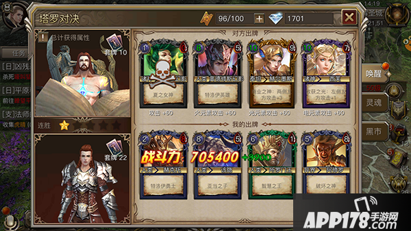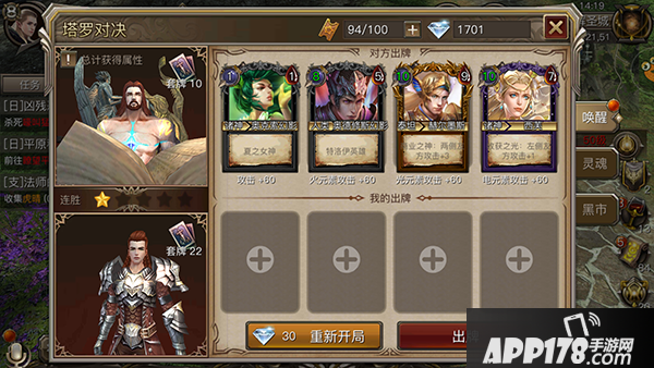 当点击开局后,神灵会选出4张卡牌参战,此时玩家可以从已有的卡牌中选取4张卡牌参战,击败对方神灵的每一张卡牌,都可以获得卡牌对应下方的属性,一次对决最多可以获得4次属性加成。注意,对战过程中,只有击败的卡牌才能获得对应属性,若未击败,则无法获得。