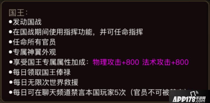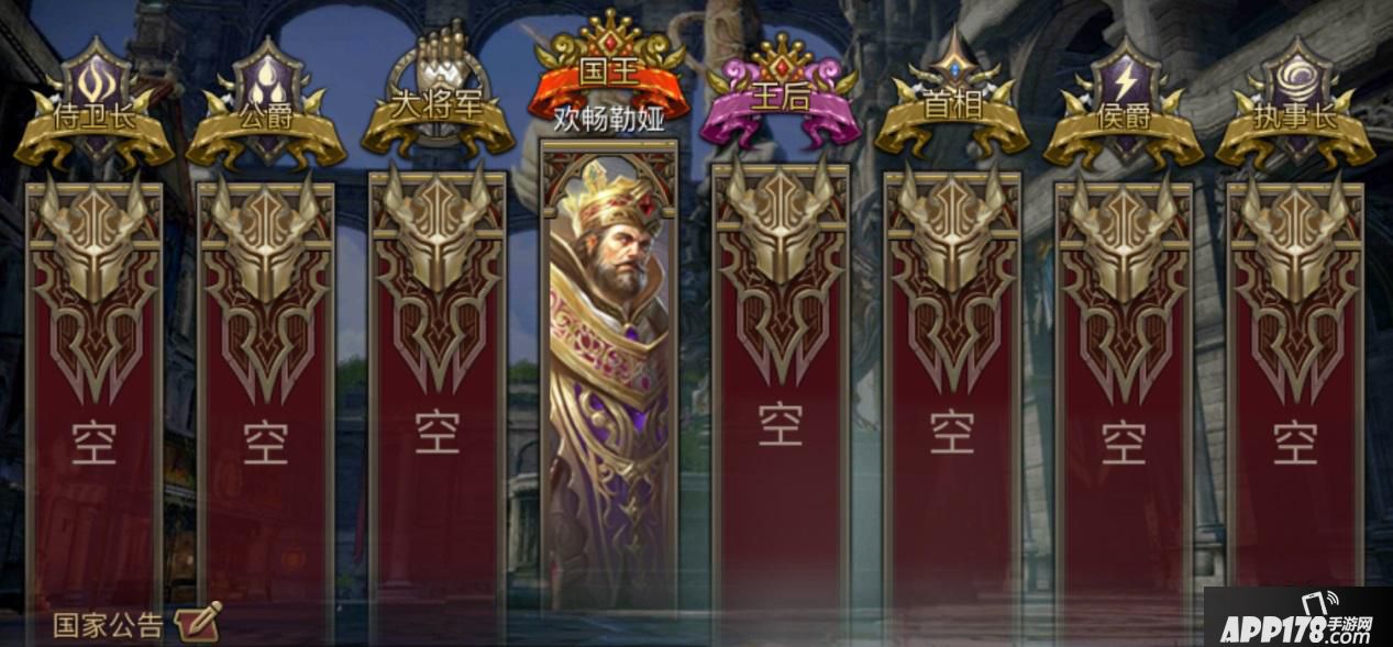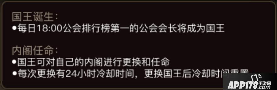 每个国家都会有一个国王,而这个国王就是公会排行榜上排行第一的公会会长。排行榜每天18:00会自动更新一次,只有最强者才能长久统治国家。