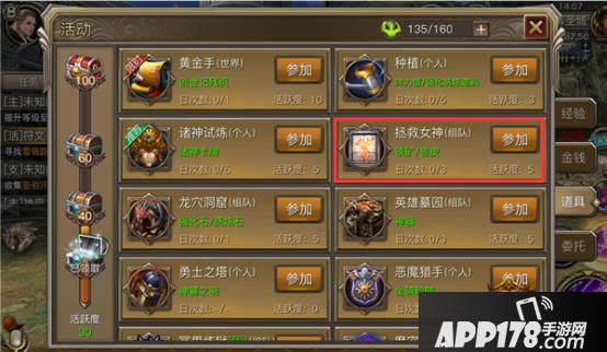 拯救女神活动每日可进入三次,活动时长半小时。只要达到24级的玩家均可参与此活动。进入活动的方法是在活动中查找“道具”标签,即可找到“拯救女神”副本。需要注意的是,进入副本后便是考验玩家们硬实力跟协作能力的时候了,在这里玩家将面对海量敌人多轮次的进攻,更要保证女神雅典娜的安全,因此需要合理的配合和精准的走位才能击退妖魔保卫女神。