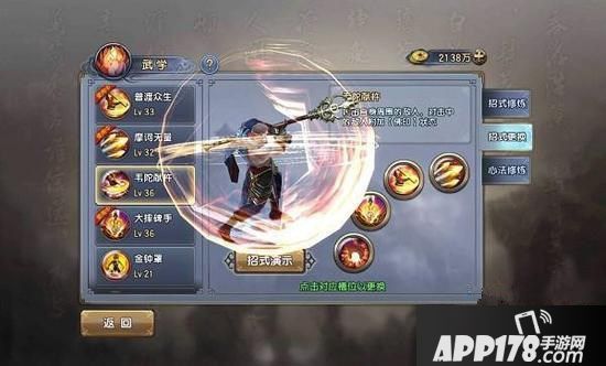 玩家可以同时修炼若干种招式,但是同时上阵使用的只有4个,如果需要更换招式,则要在招式更换中选择更换。为了让玩家更直观的感受到招式效果,玩家可以先通过招式演示来观看招式的释放和技能效果。选定某一技能后,再点击屏幕右侧的技能槽即可替换当前技能,非常的方便。