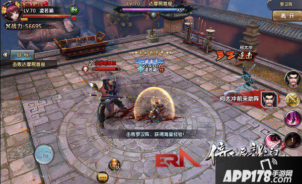 进入副本后,玩家要面对4波和尚的进攻,而且进攻强度一波比一波大。每击杀一个罗汉都可以获得可观的经验。当4波敌人完全消灭之后,玩家还要面对那个有7管血的BOSS--达摩院首座。既然能坐到首座的位子上,BOSS打人可是非常疼哦,一不小心就会被秒呢!所以建议大家在打BOSS的时候还是手动战斗吧~不要面对面硬刚啊!