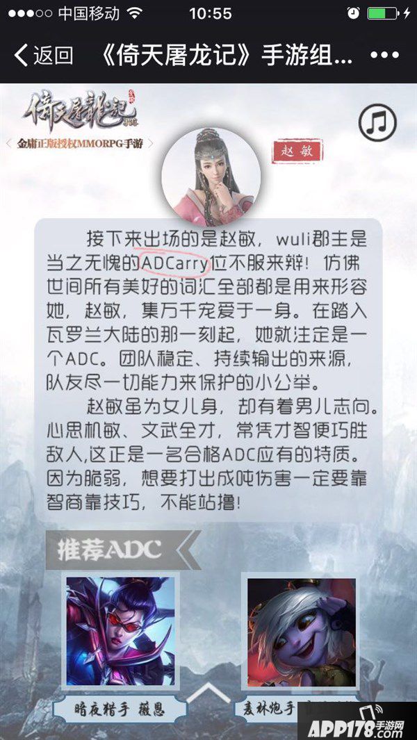 赵敏作为集万千宠爱于一身的角色,不当ADC的确有点浪费。尤其是作为一个出身显赫却武功稀松的绝世美女,备受团队倚重的carry一姐必须就得是暗影猎手和麦林炮手这类的脆皮才能诠释到位。