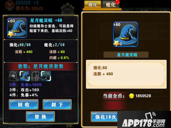 进入魔导士界面,可以看到拥有的魔导士。每个魔导士可以穿戴6件装备。每一件装备都可以强化哦。