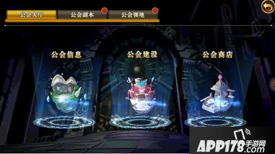 在大厅中可以查看公会信息,升级公会建筑、在公会商店中兑换奖励。