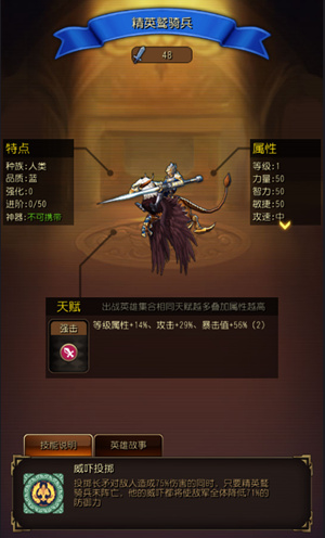 在这乱世中,公主缺乏安全感,然而你的独立能担当的性格恰恰能让公主感觉到信赖与放心,身为禁欲系的少年,唯有《英雄来挂机》中的精英鹫骑兵才配得上你。他是兵团中的佼佼者,投掷标枪的优雅姿势迷倒万千少女,他的威吓能将敌军全体降低71%的防御力。