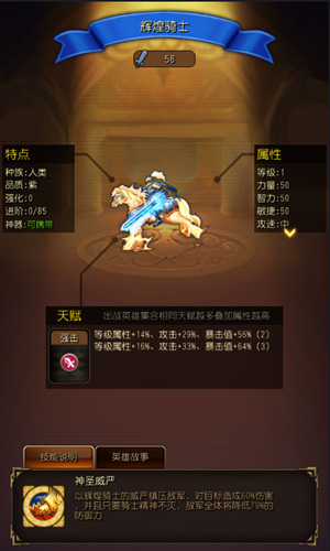 善良,作为一种优秀品质,是体现人格魅力的一面,更是你真正吸引他人的独特禀性。那么在《英雄来挂机》中,“圣骑士”或许是你最好的选择,他是古老的帝国勇士,驾驭着战马手持符文剑驰骋月空之中,手中不知沾染了多少恶魔的鲜血,每次挥砍时英勇呐喊都能增加全体友军的64%的暴击值!断剑重铸之日,骑士归来之时。