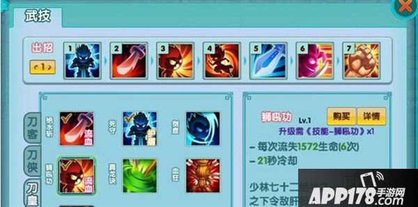 60级前:1-7依次是四面楚歌>死守>绝水斩>狮吼攻>聚气凝神>云叶斩>普通攻击